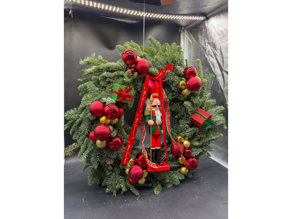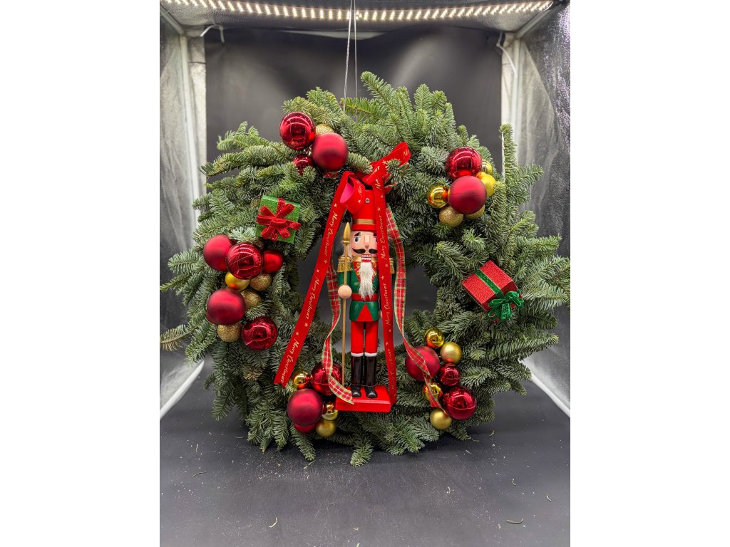 Dominantou věnce je louskáček v červeno-zelené uniformě, obklopený červenými, zlatými a třpytivými ozdobami doplněnými dárkovými balíčky a saténovými stuhami s nápisem Merry Christmas. Vše je do posledního detailu sladěno tak, aby věnec působil bohatě, harmonicky a naprosto výjimečně. 🌲