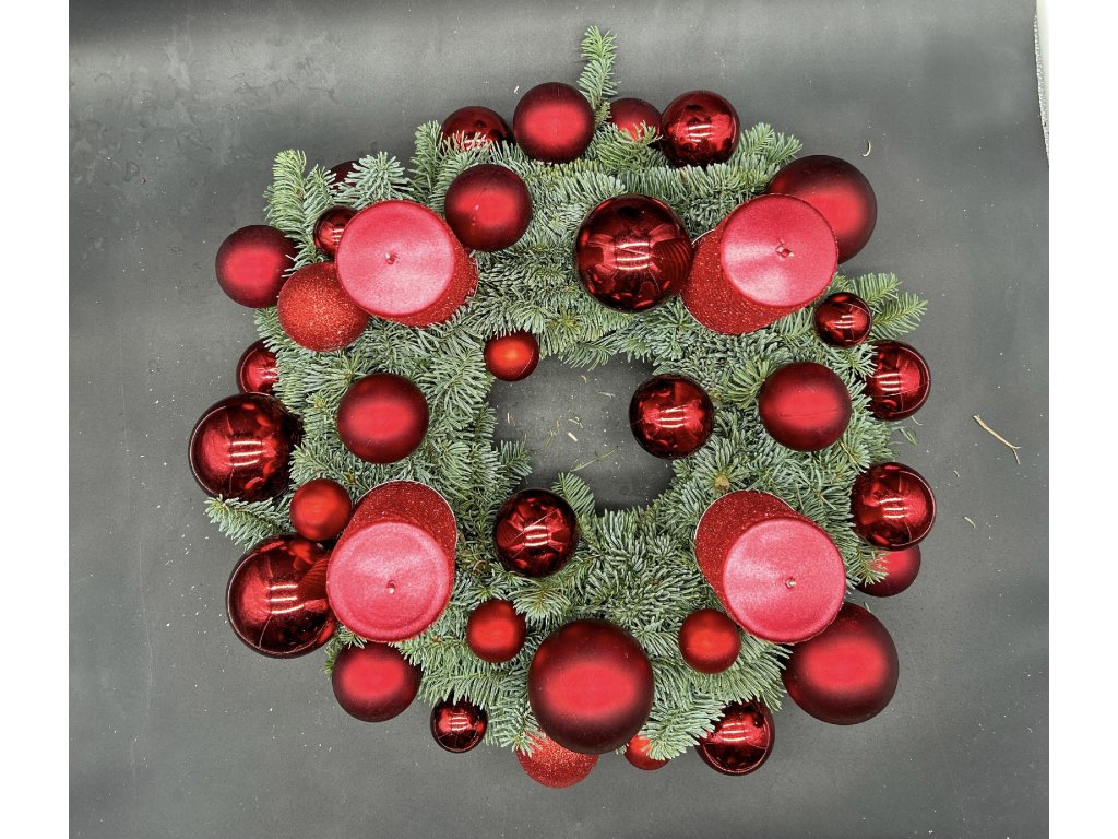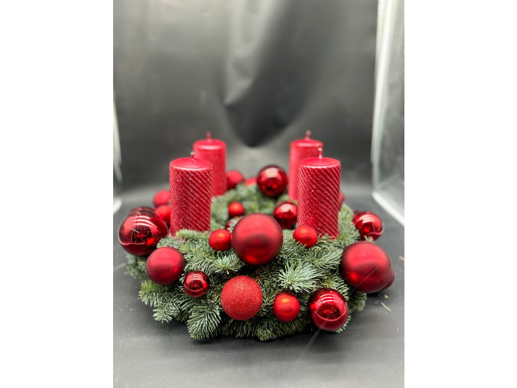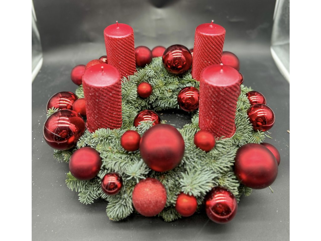 Adventní věnec z jedle kavkazské v luxusní červené se třpytivými svícemi