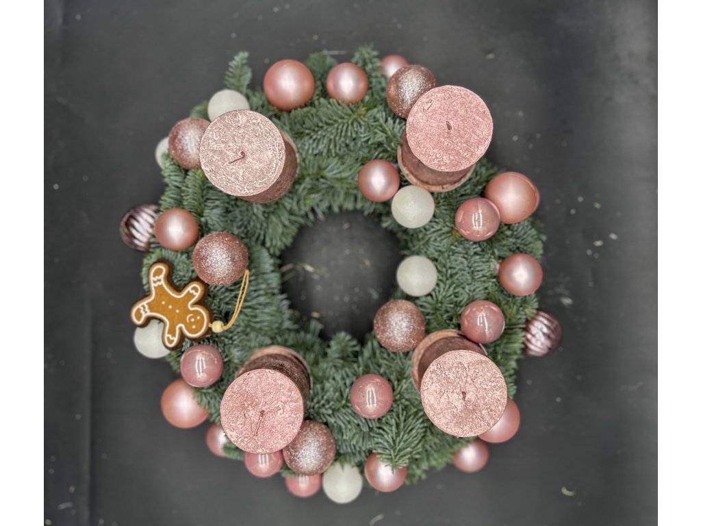 Adventní věnec z jedle kavkazské v růžovém stylu s perníčkem