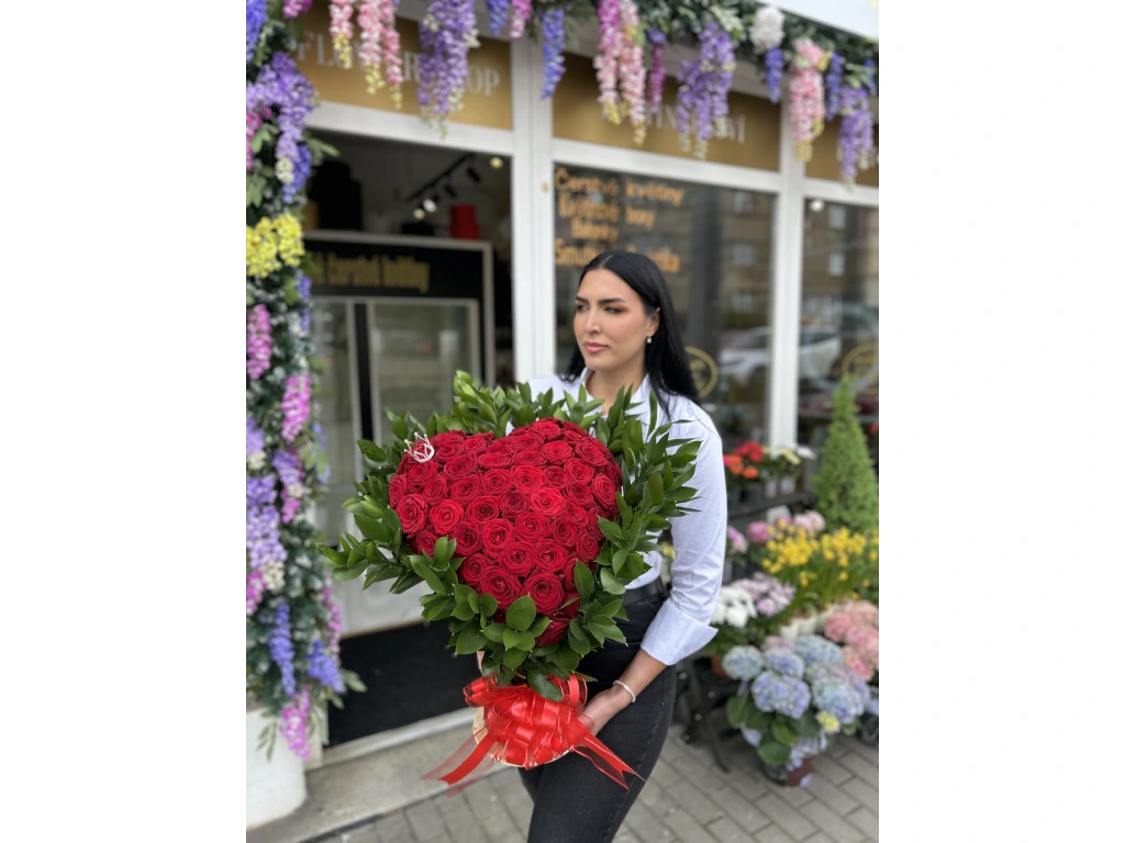 The bouquet Red Naomi Heart Bouquet – 100 Roses (Smaller Size) is designed to impress at first sight. It combines premium-quality roses with precise floral craftsmanship to create a truly luxurious experience. ✨