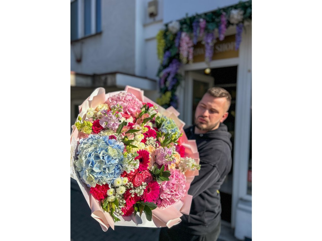Luxusní mix hortensií a růží v růžovo-modrých tónech