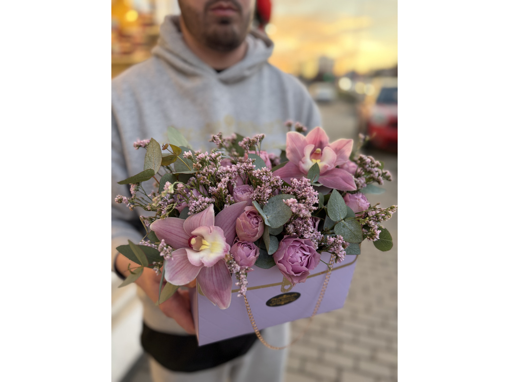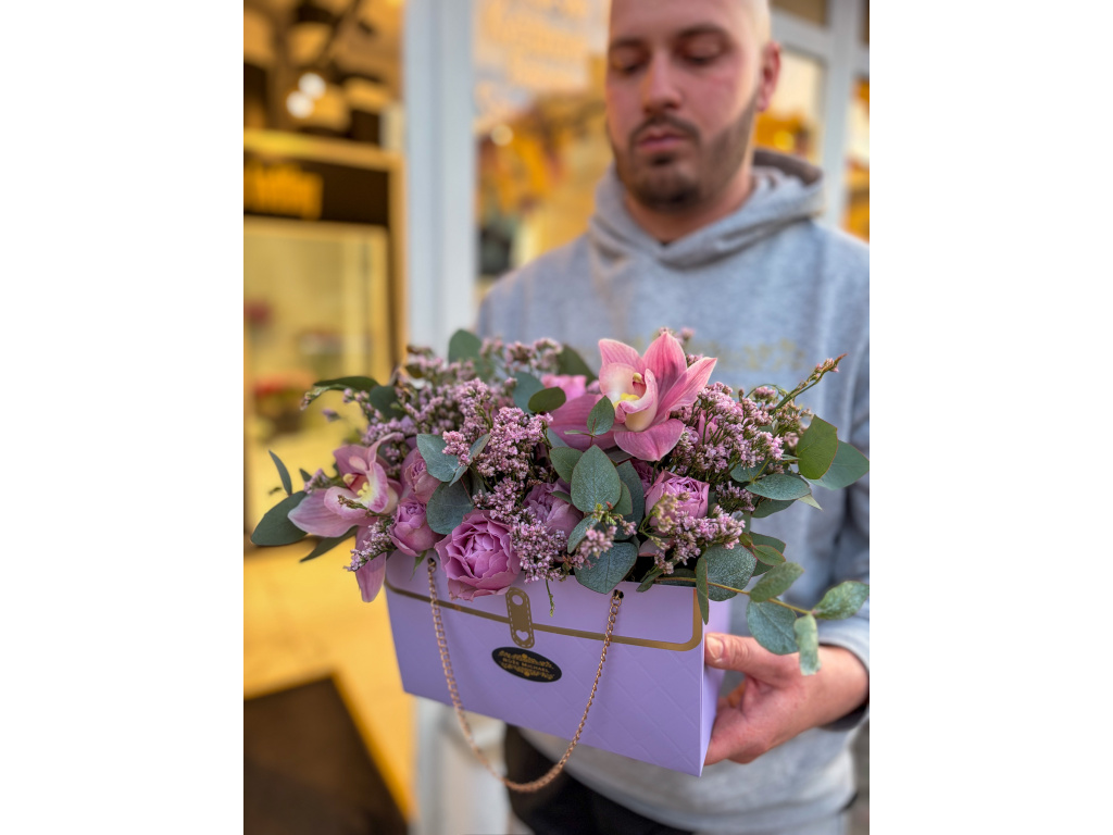 Toto elegantní květinové aranžmá ve tvaru kabelky představuje moderní a stylový květinový dárek, který zaujme svou jemností i luxusním vzhledem. Kombinace růžových odstínů, orchidejí a dekorativní zeleně vytváří harmonický celek, který působí romanticky a zároveň velmi reprezentativně. V online květinářství Růže Michael vznikají podobná aranžmá ručně a s maximální pečlivostí, aby každý detail působil dokonale.