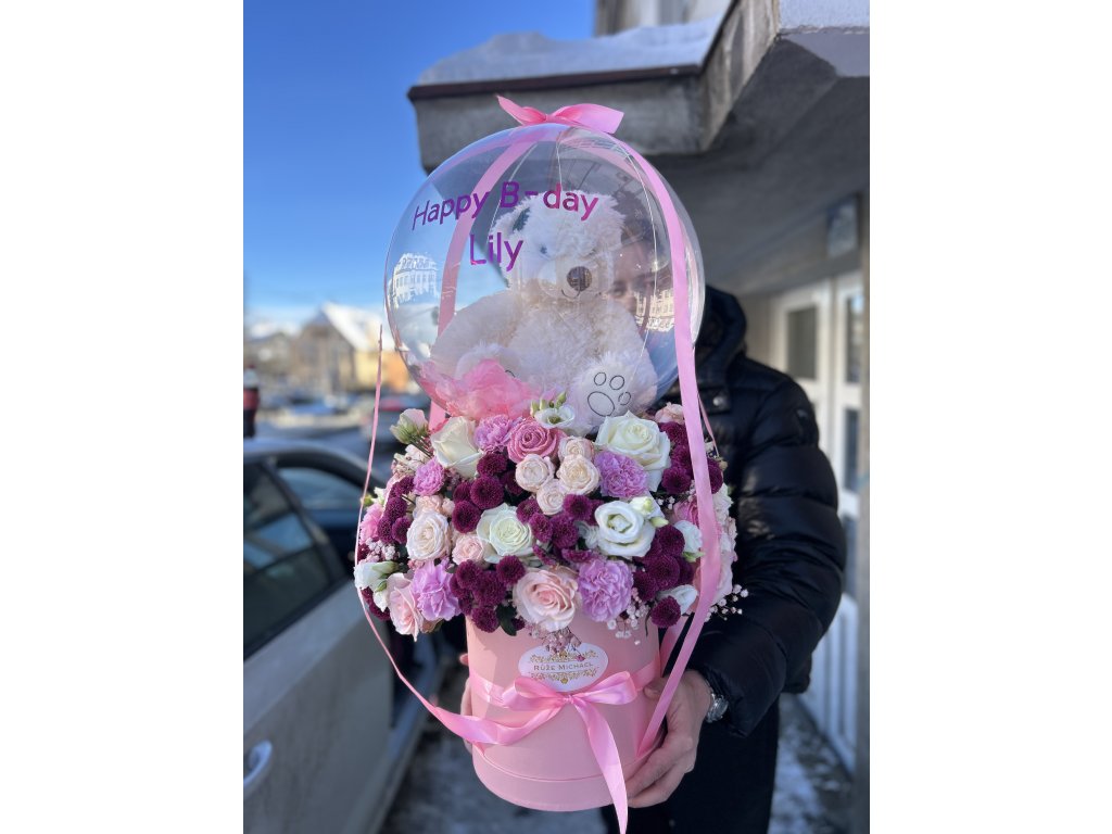 Tento květinový box spojuje jemnost květin a kouzlo osobního vzkazu do jednoho dokonalého dárku. 🎀 Průhledný balónek s vlastním potiskem a plyšovým medvídkem uvnitř vytváří okamžitý „wow efekt“, který rozzáří narozeniny, výročí i jakoukoli speciální chvíli.