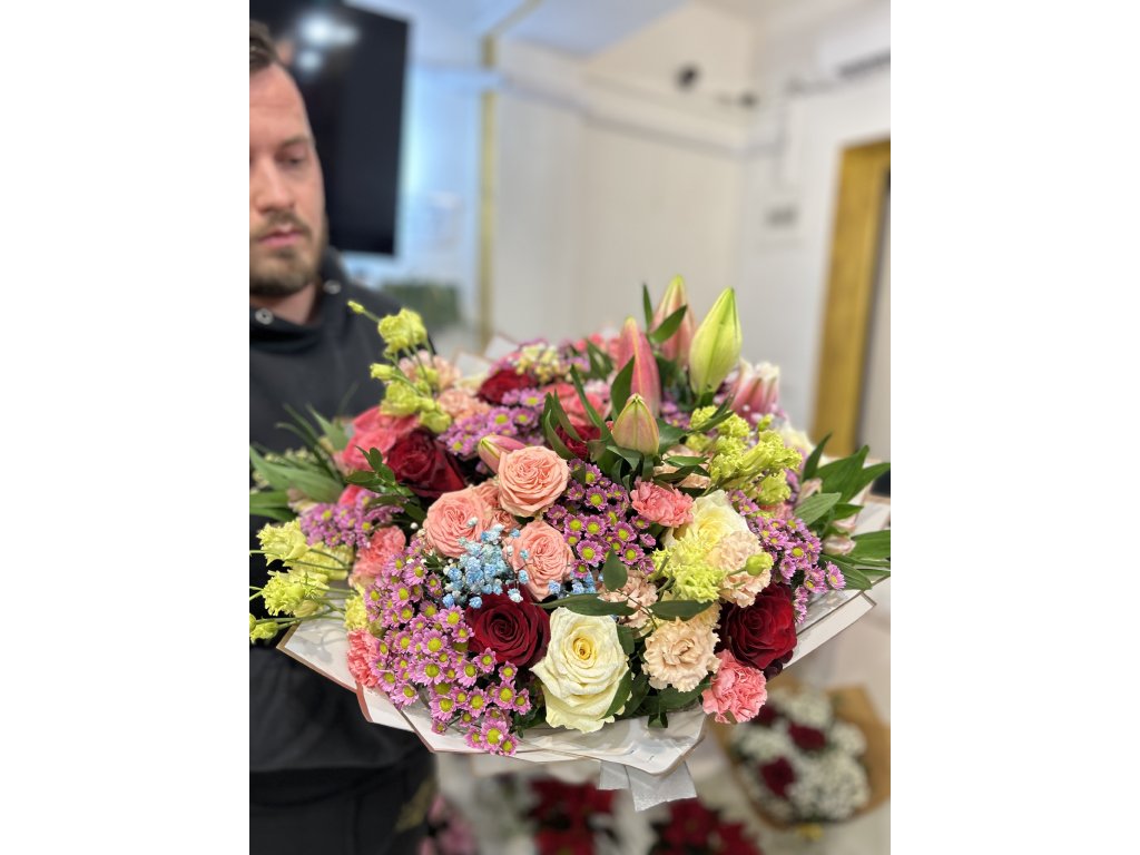 Tento jedinečný pugét je oslavou romantiky a elegance 🌸. Vytvořen je z růží, lilií, eustom, alstromerií, chryzantém a jemných doplňkových květin, které dohromady tvoří dokonalou harmonii barev od pastelově růžové až po sytě červenou.