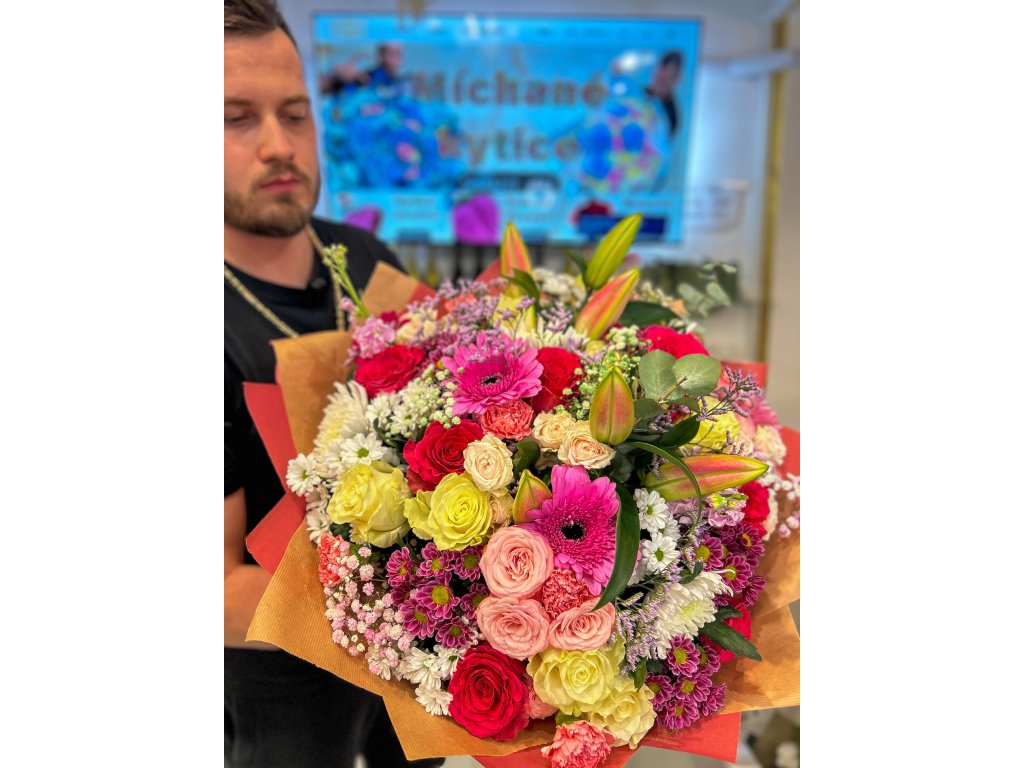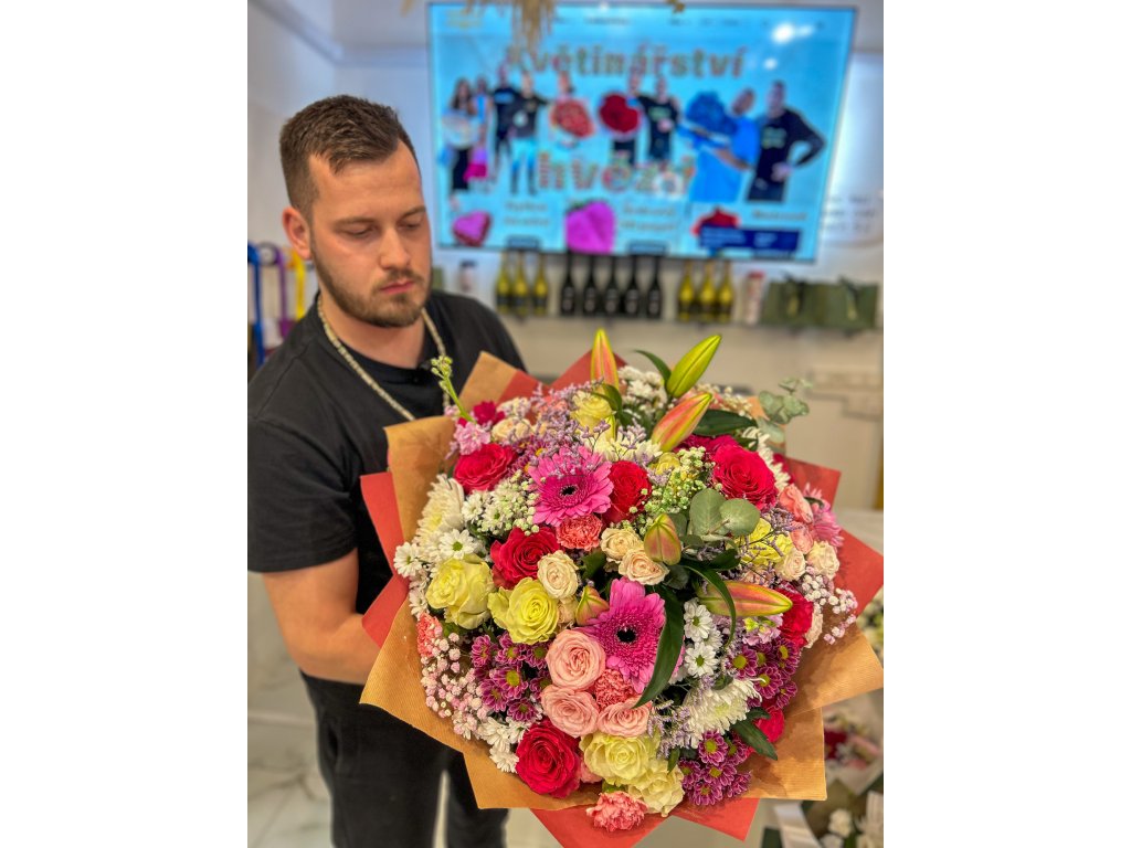 Tato okouzlující míchaná kytice je jako malý festival barev a emocí 🌸. Spojuje v sobě luxusní růže, hravé gerbery, svěží lilie, něžné eustomy a zářivé chryzantémy, které dohromady vytvářejí dokonalou květinovou harmonii. Každý květ přináší jiný tón – od romantiky přes radost až po jemnost – a dohromady tvoří nezapomenutelný celek. 💐