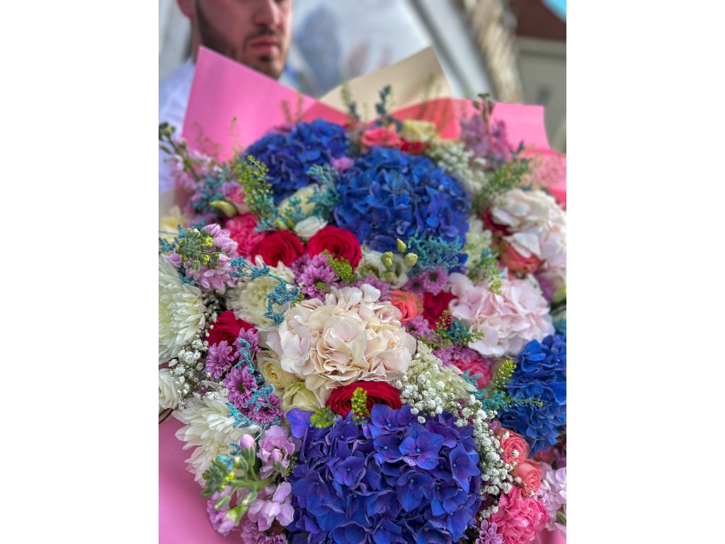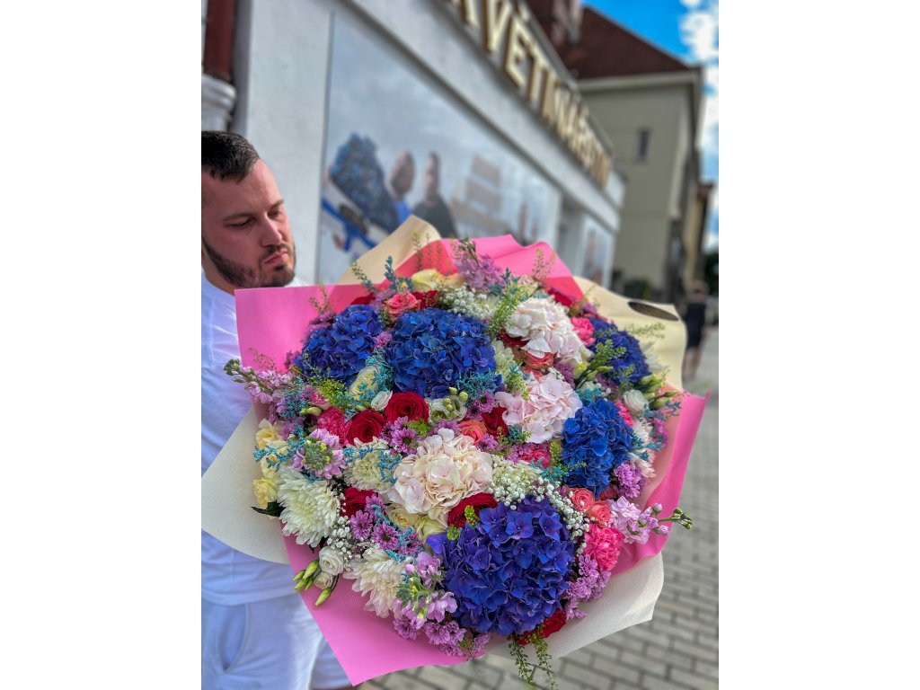 Luxusní míchaná kytice, která okouzlí na první pohled svou královskou kombinací barev. Dominují v ní výrazné modré a fialové hortenzie, jemné světlé růže i sytě červené růže, doplněné o romantické růžové trsové růže, elegantní matthioly, jemné eustomy, výrazné karafiáty, decentní chrysantémy a oblíbená gypsophila. Celek doplňuje svěží zeleň, která kytici dodává přirozený a elegantní vzhled. 🌸
