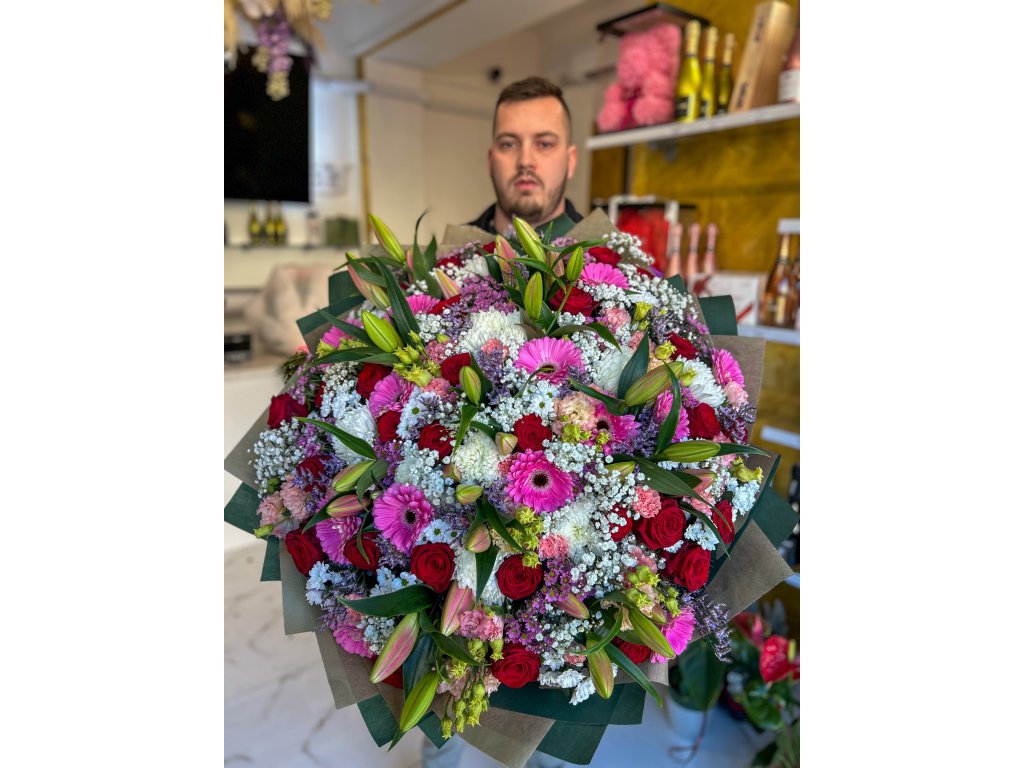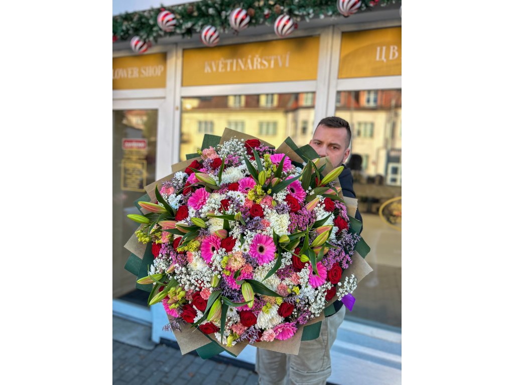 Pokud hledáte kytici, která zanechá nezapomenutelný dojem, pak je tato kombinace tou pravou volbou. Tóny červených růží, jemných růžových gerber a voňavých orientálních lilií se snoubí s bílými chryzantémami, něžnými karafiáty a drobnými alstromériemi. O romantickou atmosféru se postará nevěstin závoj a jemná limonka/statice, které celé vazbě dodají vzdušnost a lehkost.