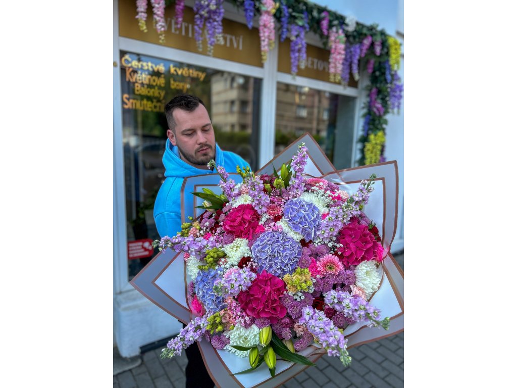 Tato luxusní míchaná květina je jako malovaný obraz léta – plná barev, kontrastů a elegance. Dominantní modré hortenzie se zde snoubí s bohatými růžemi a romantickými karafiáty. Atmosféru jemnosti dodává eustoma, chryzantémy, nadýchaná gypsophila a statice v růžových a fialových odstínech. Celek doplňují výrazná poupata lilií, která kytici propůjčují slavnostní rozměr.