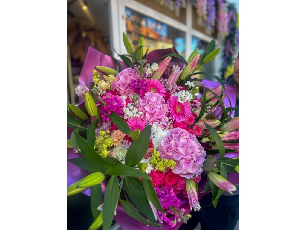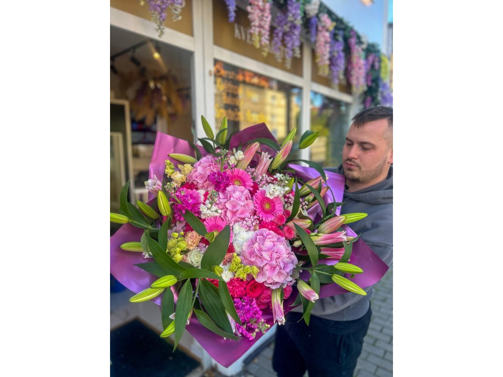 Romantická a bohatá kytice, která v sobě spojuje něhu i eleganci. V této kompozici se dokonale snoubí hortenzie, lilie, jemné růže a trsové růže, doplněné o zářivé gerbery, voňavou matthiolu, elegantní eustomu a něžnou gypsophilu. Společně vytvářejí okouzlující barevnou harmonii, která působí luxusně a zároveň romanticky.