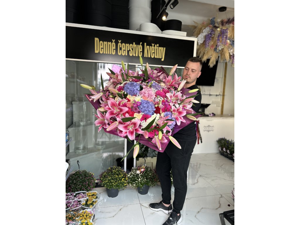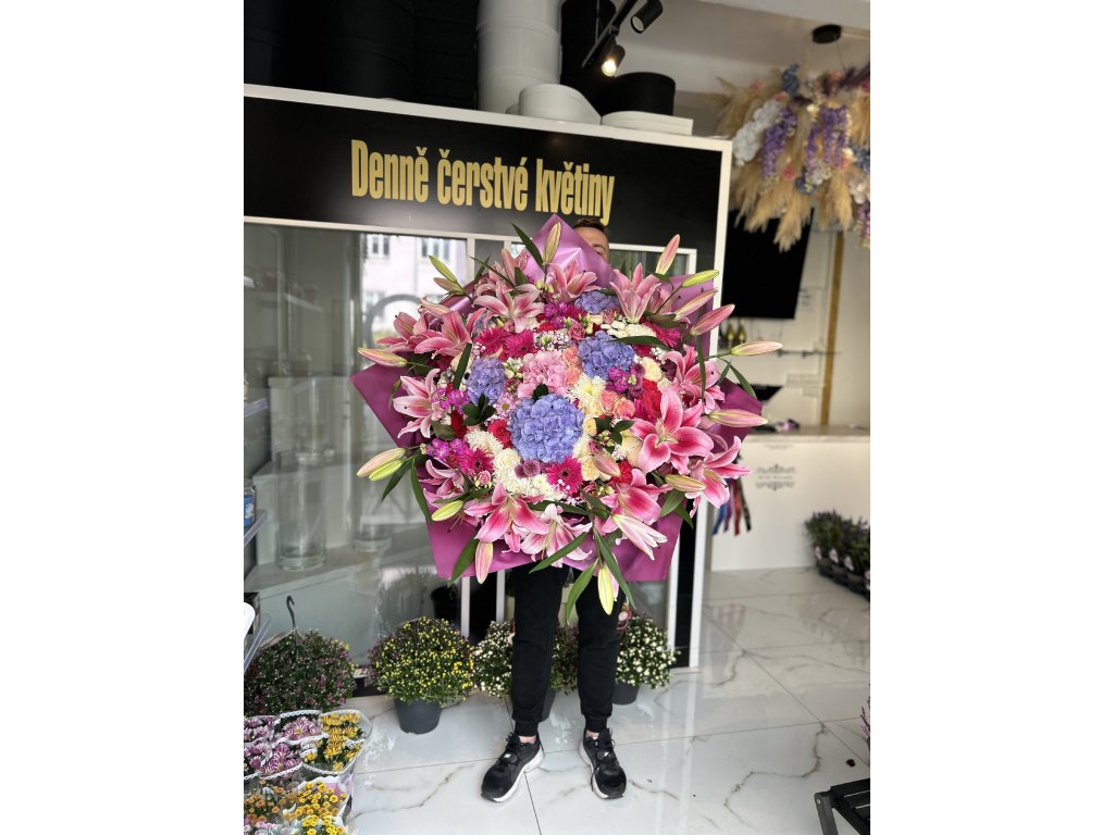 Luxusní míchaná květina v bohatém růžovo-fialovém tónu, které vládnou voňavé orientální lilie a sametové hortenzie. Doplnili jsme je o velké gerbery, krémové chryzantémy, růže a trsové růže, jemnou gypsophilu, vzdušné matthioly, eustomy, sezonní alstromerie, drobné limonium a svěží zeleně (ruscus/salal). Květina je balena do reprezentativního lesklého papíru v barvách kytice a svázána stuhou.