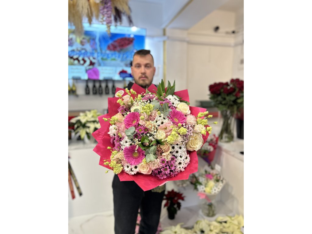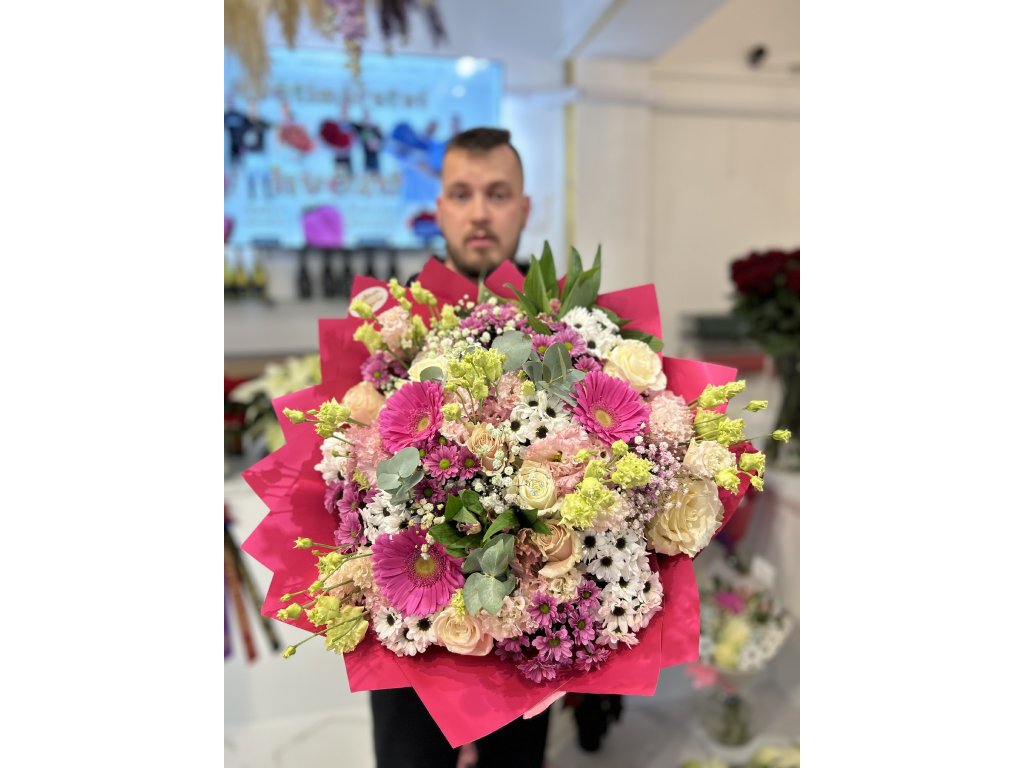Okouzlující květinová kompozice, která spojuje červené růže, pastelové gerbery, bílé chryzantémy, lilie a doplňkové květy do harmonického pugétu. Tento bohatý mix působí něžně a romanticky, přesto je dostatečně výrazný, aby se stal hlavní ozdobou každé příležitosti 🌸.