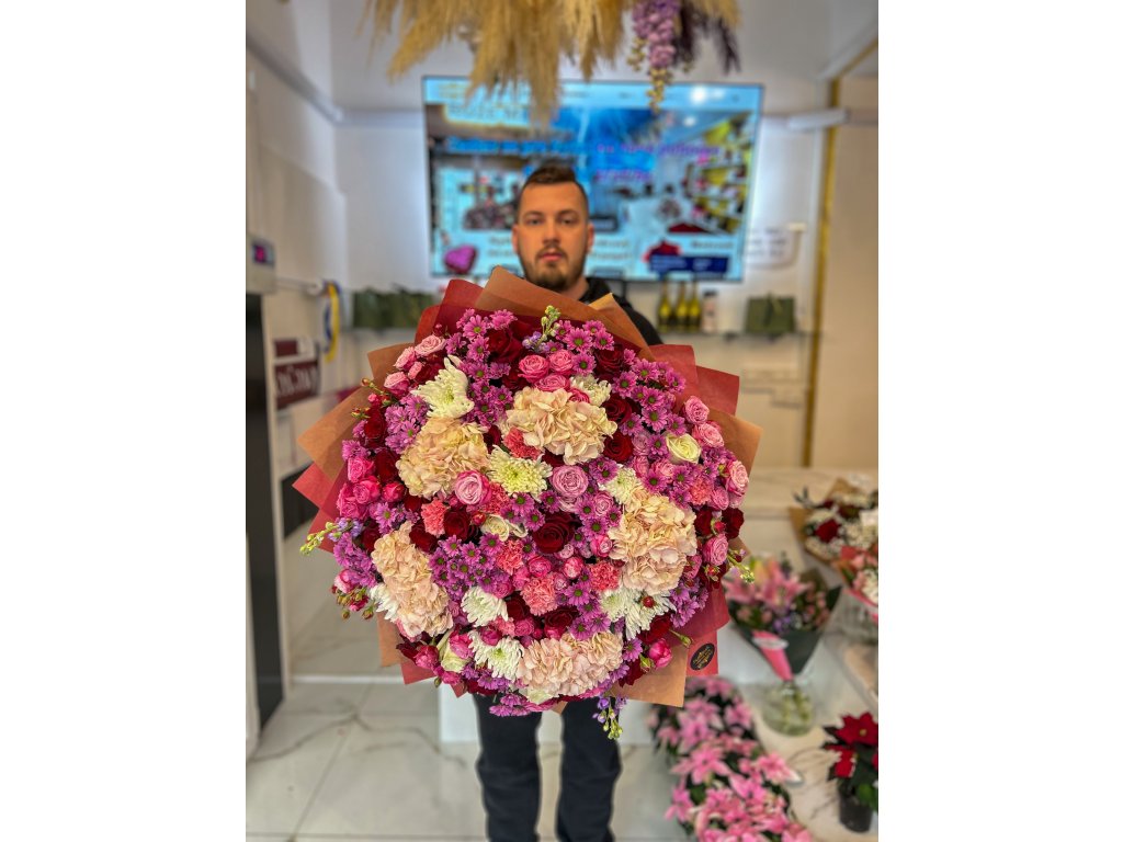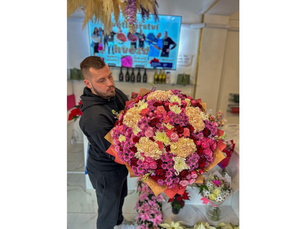 Velká romantická kytice v bohaté kulaté vazbě. Kombinujeme sytě růžové a červené růže, hebké karafiáty, jemné chryzantémy a růžové santini. Akcenty eustomy, hyperica a svěží zeleně dodávají kytici šmrnc i výdrž. Na fotografii je velikost XXL.
