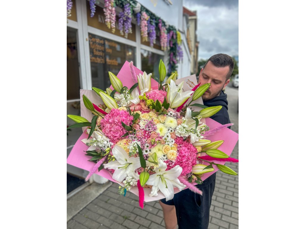 Výjimečná kytice, která spojuje eleganci a romantiku 💖. Bohatá kombinace bílých lilií, vznešených hortenzií, jemných růží a trsových růží, doplněná o jednokvěté chryzantémy, matthioly, eustomy, alstromerie a gypsophilu, vytváří dokonalý pugét, který osloví každého, kdo miluje luxus a krásu.