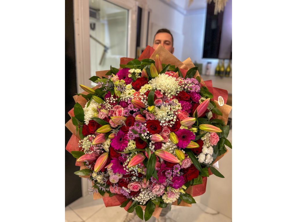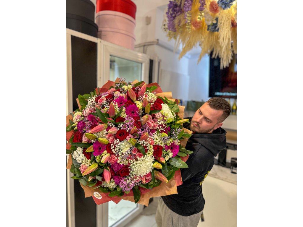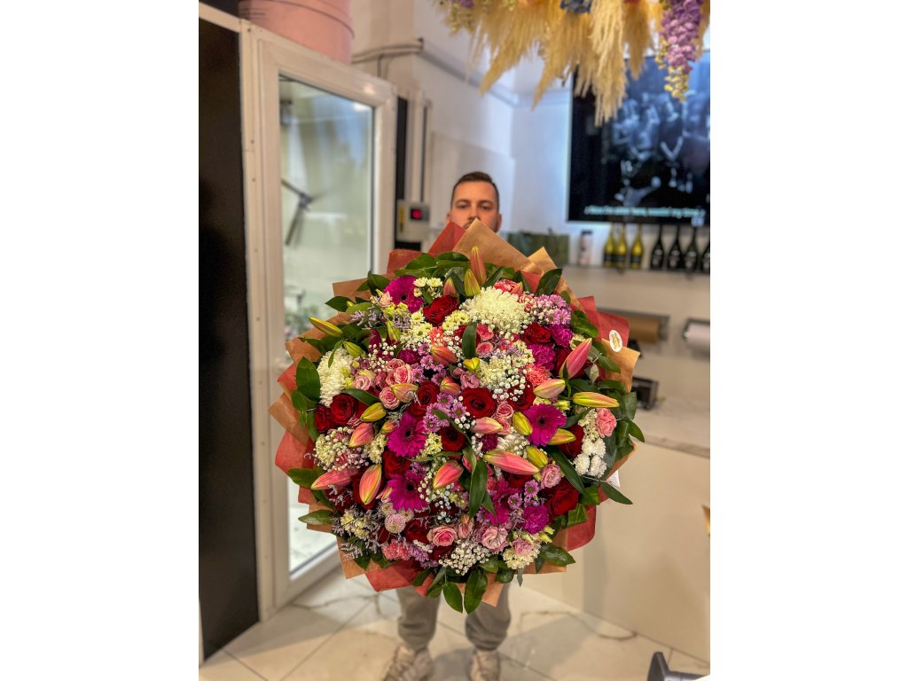 Velkolepá kulatá kytice v romantických tónech růžové, krémové a malinově červené. Dominují růžové orientální lilie (část v poupatech pro delší výdrž), doplněné o klasické červené růže, růžové trsové růže, velké gerbery v cyklámenově růžové, bílé chryzantémy (disbudy/jehličkové), jemnou gypsophilu, limonium/liláč a svěží zelené listy (ruscus/salal). Každý svazek pečlivě vážeme do bohatého kruhu a balíme do kvalitního dárkového papíru.
