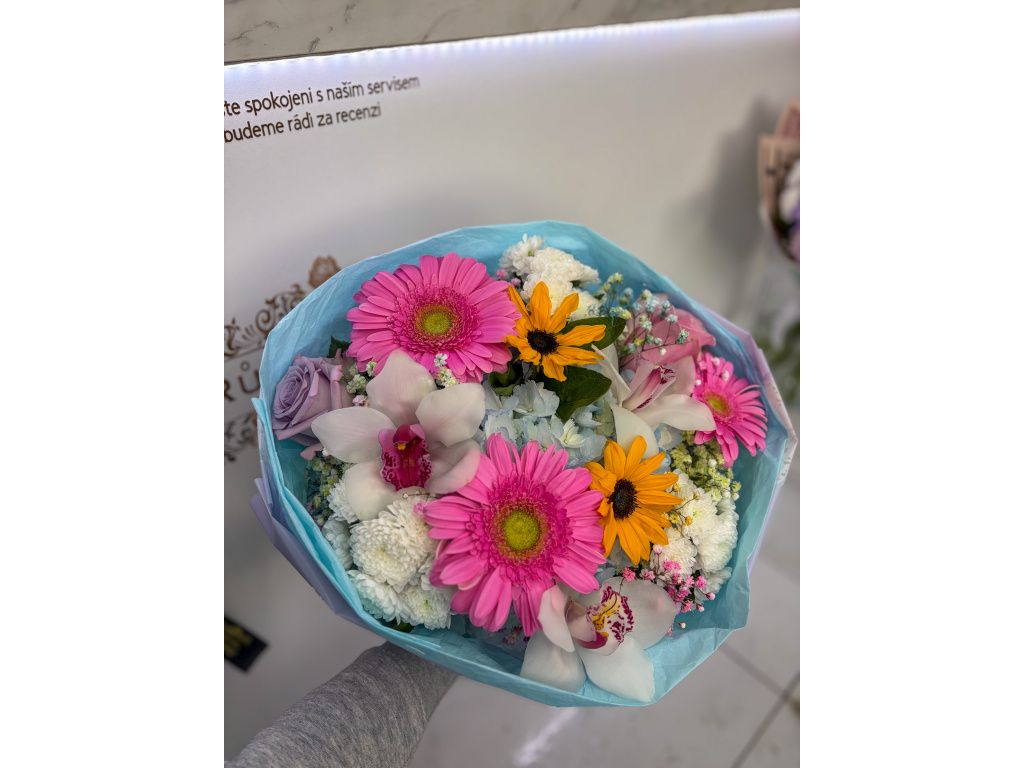 Dominantou kytice jsou výrazné růžové gerbery doplněné o elegantní orchideje, které dodávají celé vazbě exkluzivní nádech. Nechybí ani jemná hortenzie, bílé santini a svěží žluté květy, které celou kompozici krásně rozzáří. Výsledkem je kytice, která působí lehce, vzdušně a velmi stylově.