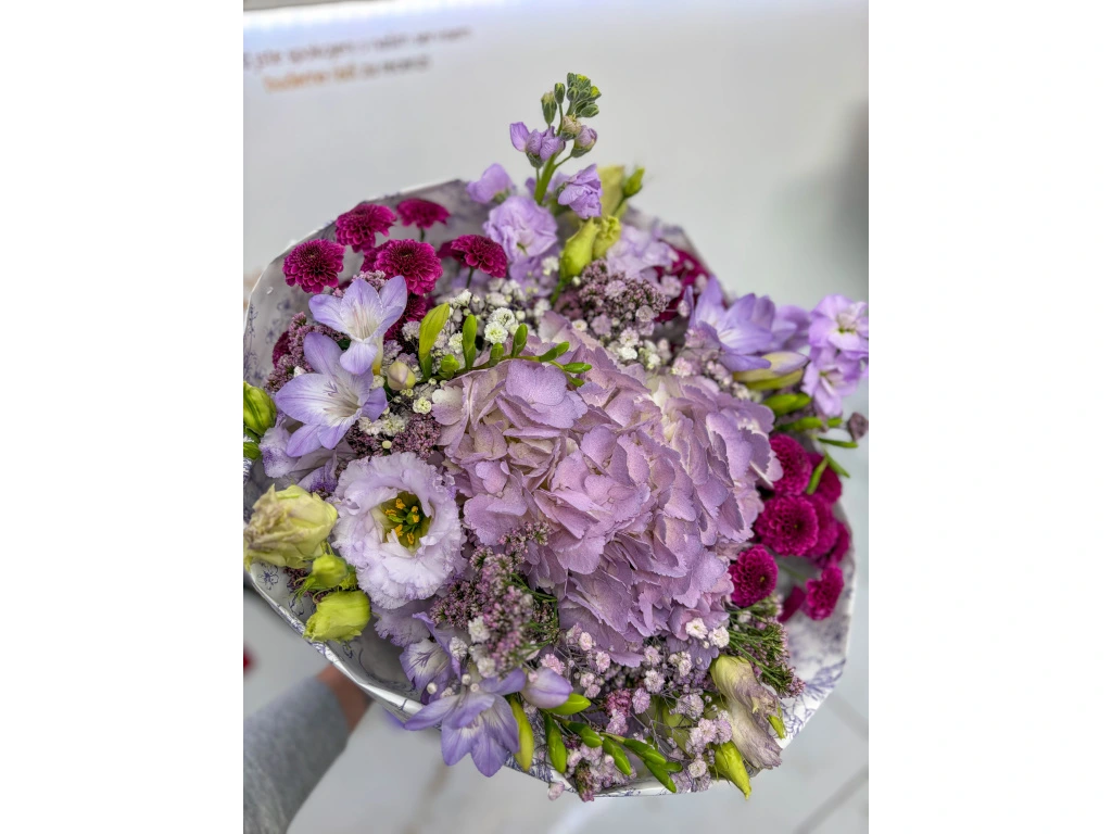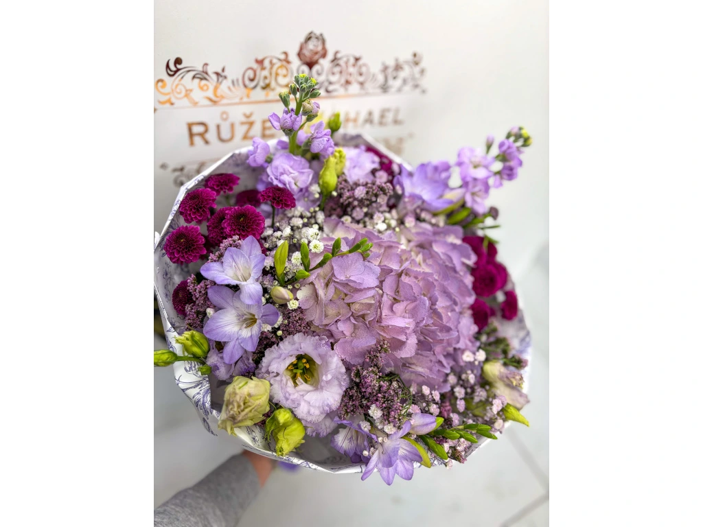 Dominantou kytice je bohatá hortenzie v jemném fialovém odstínu, která dodává celé vazbě objem a noblesní vzhled. Doplněná je o eustomu, frézie a drobné santini, které společně vytvářejí lehkou, vzdušnou a velmi sofistikovanou kompozici. Každý detail je pečlivě sladěný tak, aby kytice působila přirozeně a zároveň výjimečně.