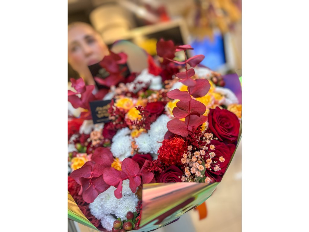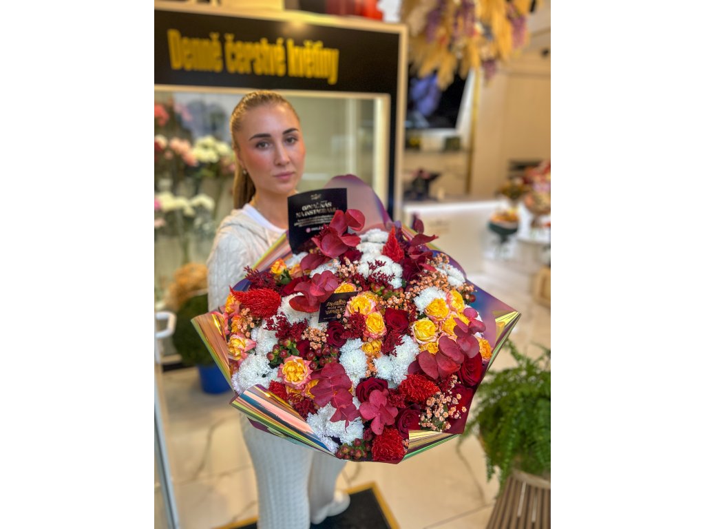 Teplé odstíny vína, zlata a krémové bílé proměňují každý okamžik v luxusní zážitek. Tahle sezónní kompozice je navržená tak, aby okamžitě zaujala – bohatý objem, perfektní kontrasty a precizní vázání, které je pro květinářství Růže Michael typické.
