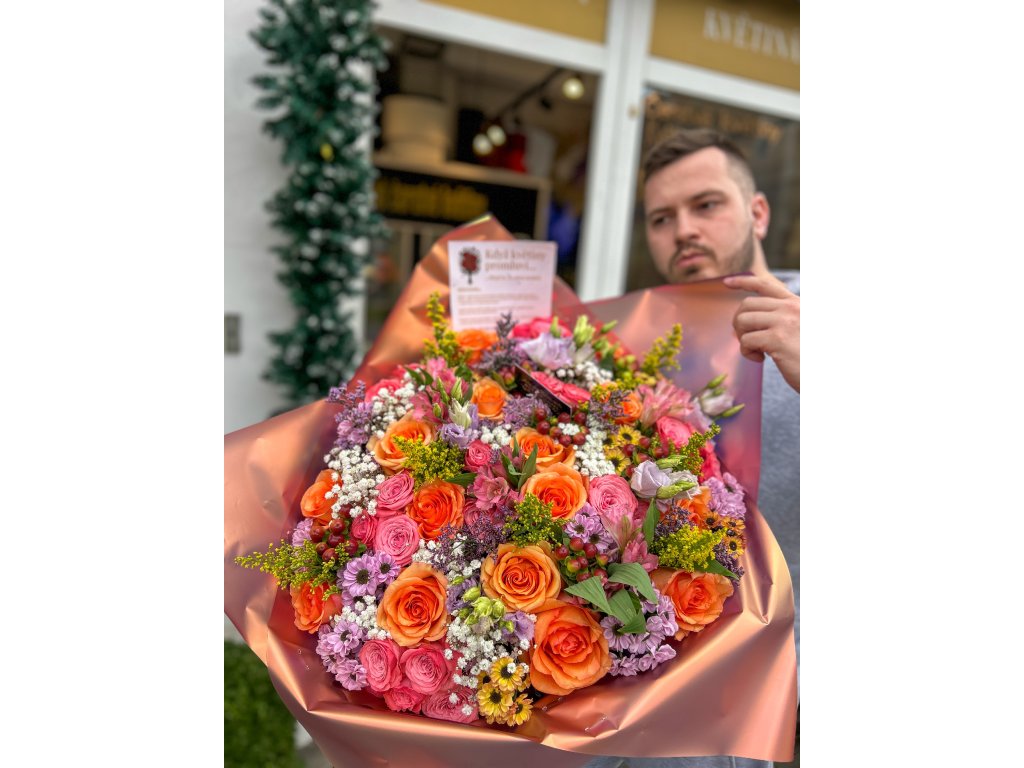 - Čerstvé květiny prémiové kvality: růže, chryzantémy, eustomy, gypsophila, hypericum a solidago – ručně svázané s důrazem na detail.