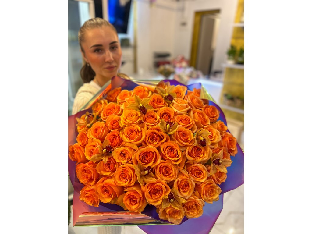 Kytice je tvořena z 51 prémiových oranžových růží a 9 květů orchideje. Kombinace těchto druhů vytváří harmonickou kompozici s hřejivým podzimním nádechem a nádechem exotiky. Každý květ je pečlivě vybrán našimi floristy a ručně svázán s maximální precizností.