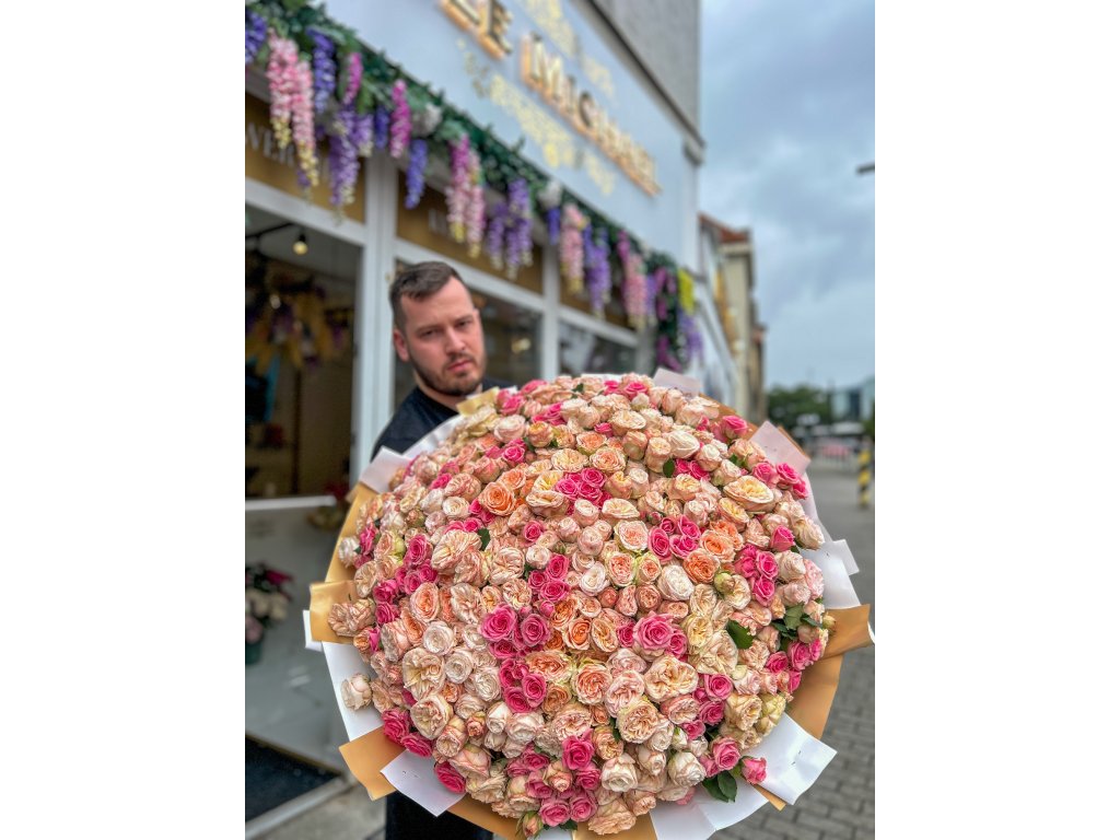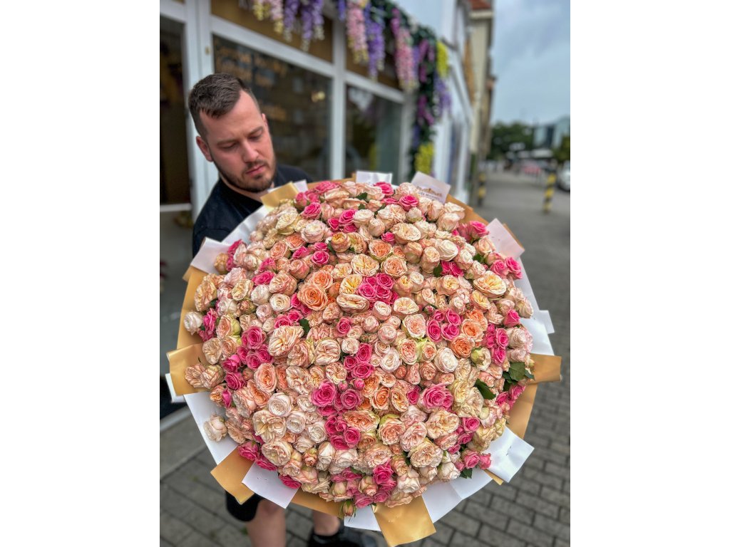 Bohatá kytice složená výhradně z prémiových trsových růží v harmonickém mixu růžových, pudrových a broskvových odstínů. Každý stonek nese několik drobnějších květů, díky čemuž pugét působí neobyčejně plně a luxusně. Ideální pro velké gesto – výročí, zásnuby, narozeniny nebo jako překvapení, na které se nezapomíná. 🌹