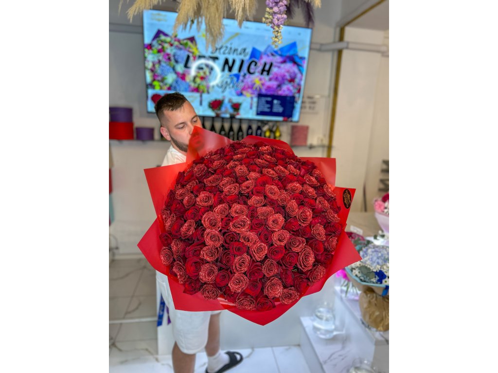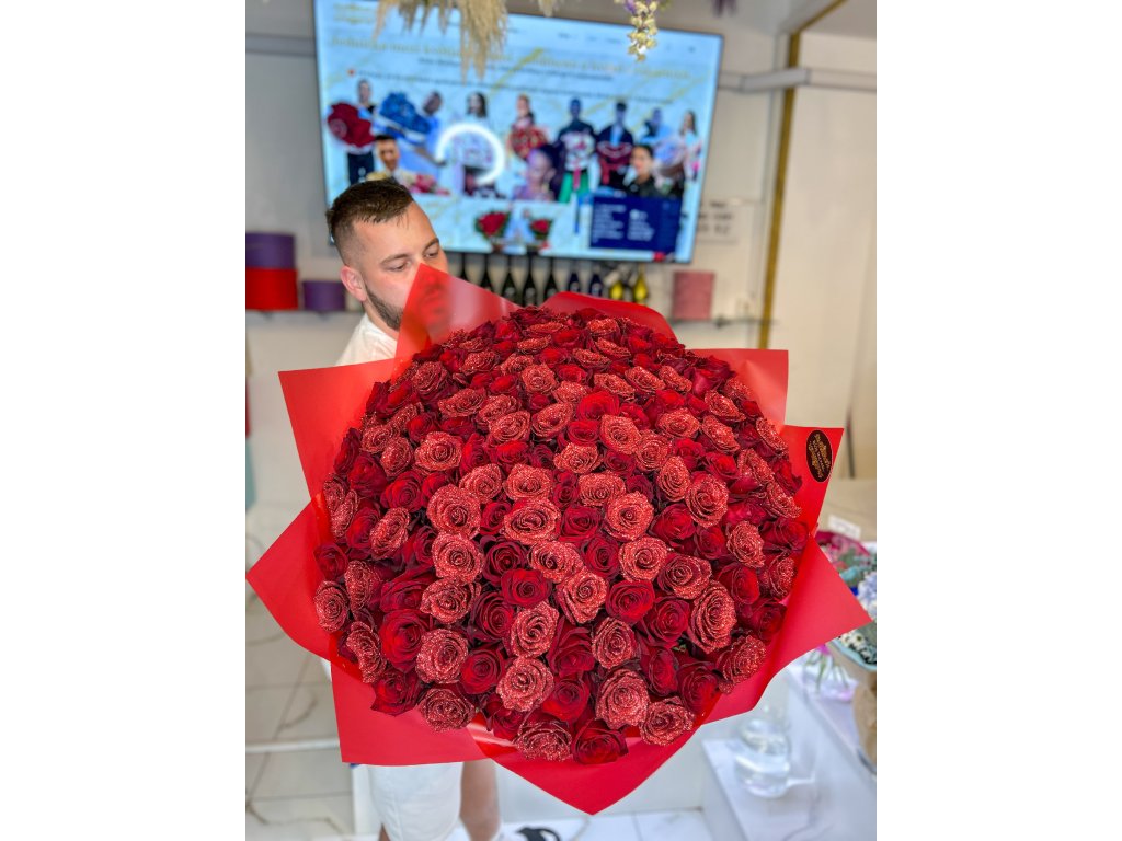 Poznámka: Poměr klasických rudých a třpytivých růží je aranžován tak, aby kytice působila harmonicky a luxusně. Počet růží je vždy přesný podle vybrané varianty.