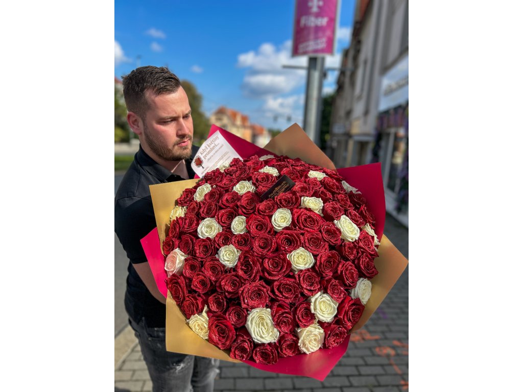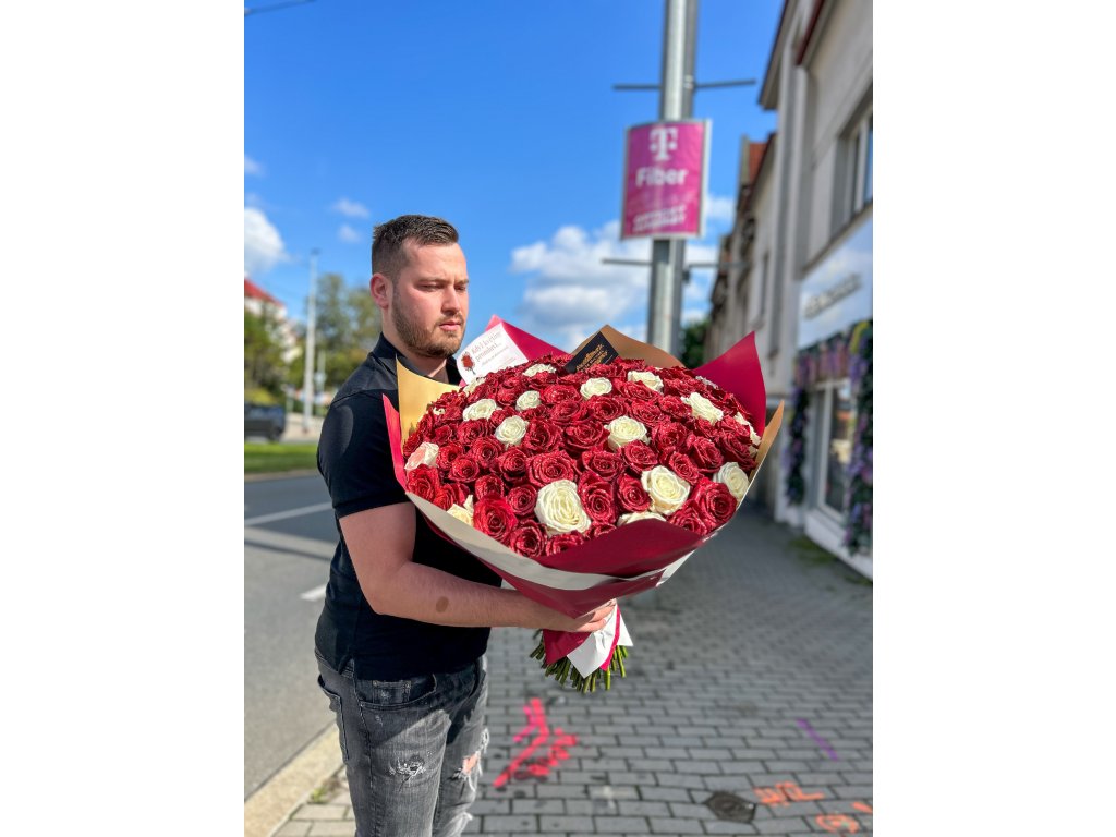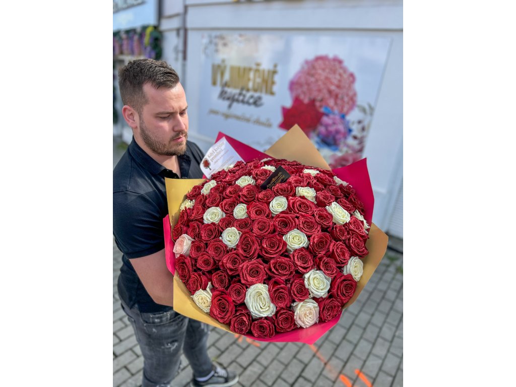 Poznámka: Poměr rudých třpytivých a bílých růží je aranžován do vyvážené kompozice. Přesný počet jednotlivých barev se může lišit dle varianty, ale celkový počet růží vždy odpovídá zvolené velikosti.
