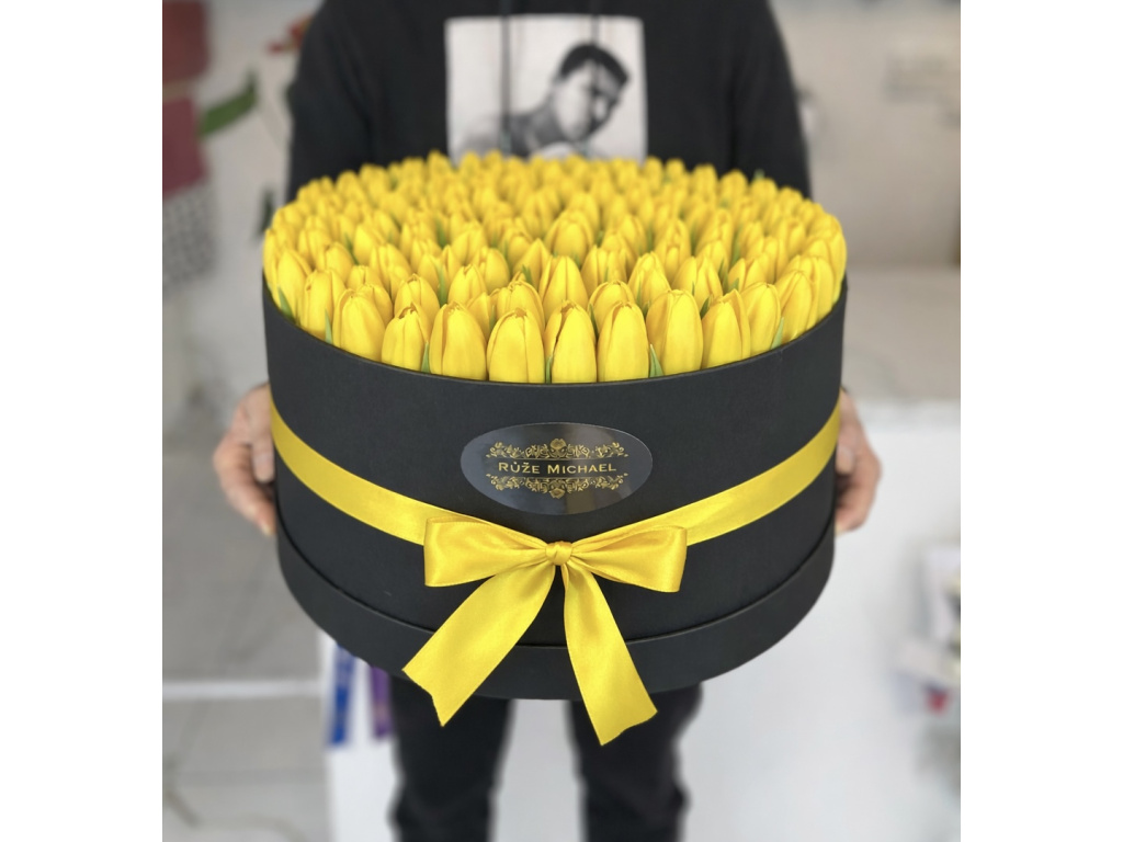 Zářivý květinový box plný žlutých tulipánů představuje energický a radostný dárek, který okamžitě rozzáří den každému obdarovanému. Bohaté aranžmá obsahuje až 170 tulipánů, které vytváří velkolepý objem a skutečně luxusní vzhled.